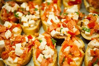 Приготовить топпинг мы должны успеть ровно за то время, что находятся наши кусочки с хлебом в духовке, а значит за десять минут. Берем нашу лопатку (она же у вас есть, верно?) и достаем из духовки наши куски хлеба, которые за это время подрумянились. На куски багета мы начинаем выкладывать все, что делали до этого, сперва топпинг (главное все разложить равномерно), а затем уже и сыр моцарелла, потом снова ставим в духовку на десять или пятнадцать минут. Пока наша закуска будет находиться в духовке, сыр успеет расплавиться, а помидорки запекутся и станут мягче.