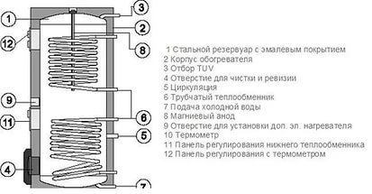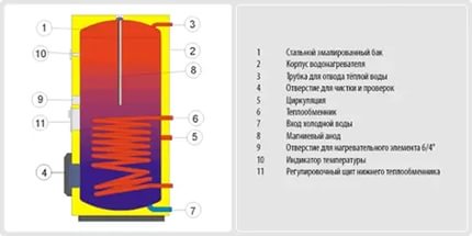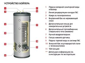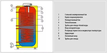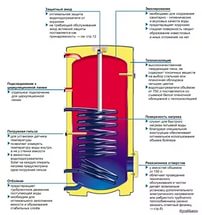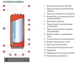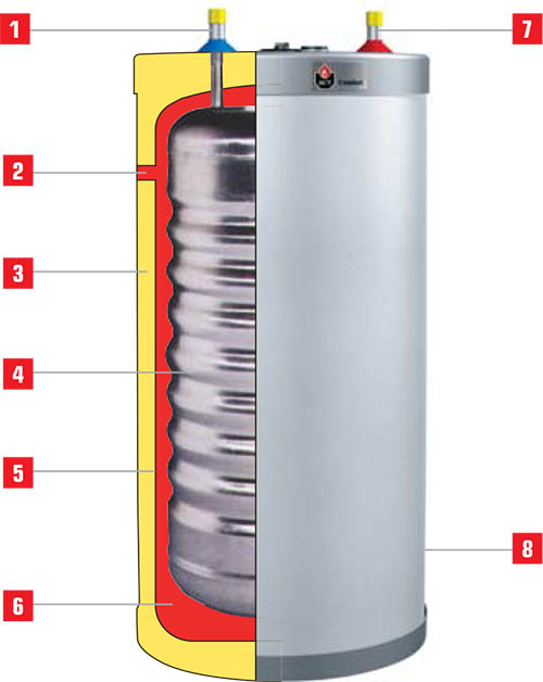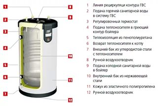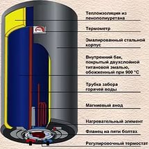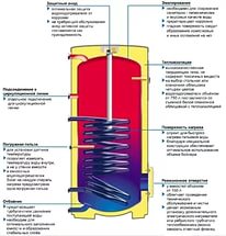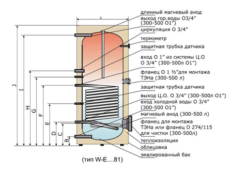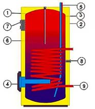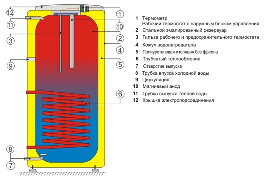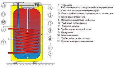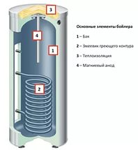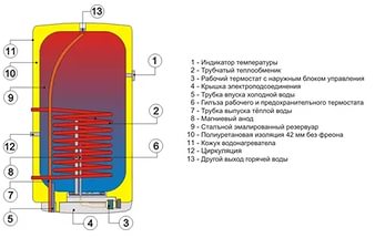 В первую очередь, вы должны знать, что конструкция водонагревателя косвенного нагрева предоставляют собой бак, который наполняется водой, обычно его форма цилиндрическая, внутри у него расположена спираль. Благодаря уникальным формам, происходит скорый нагрев большого количества воды. У качественных агрегатов всегда корпус должен быть изготовлен из стали и пластика, так как считается, что эти материалы надежные и долговечные. Следующий слой, который покрывает агрегат, состоит из эмали.