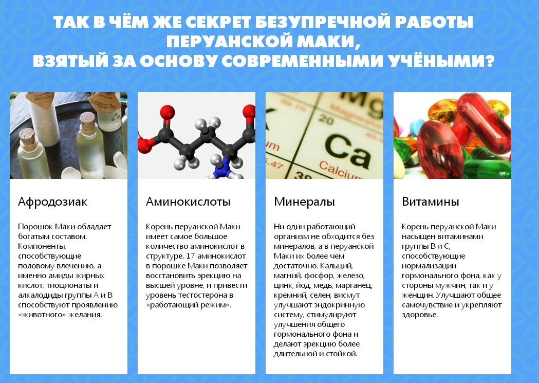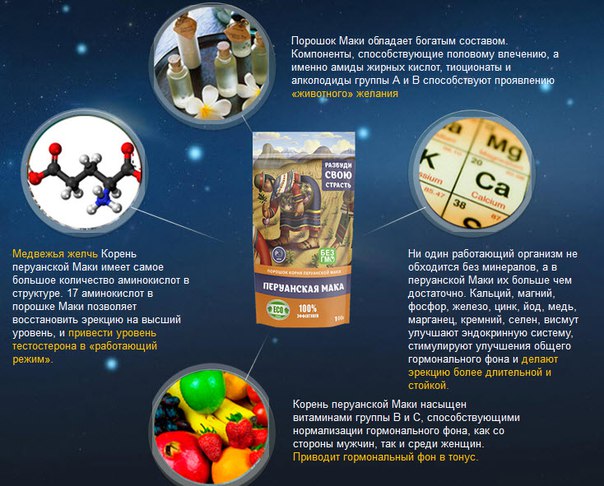 Перуанская мака замедляет процессы старения, тонизирует организм. Кроме того, укрепляется сердце, сосуды, нормализуются обменные процессы. Для того чтобы повысить работоспособность, этот продукт просто незаменим. То же касается снижения негативного действия лучевой терапии. Вы забудете о синдроме хронической усталости, вылечите аритмию. Улучшается память — это тоже очень важный момент.