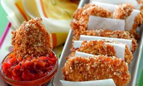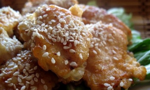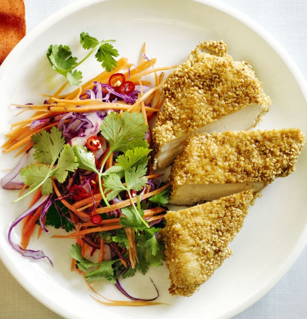 Цыпленок в кунжутной панировке отлично сочетается с красной капустой шинкованной, приправленным имбирем, чили и свежим соком лайма.