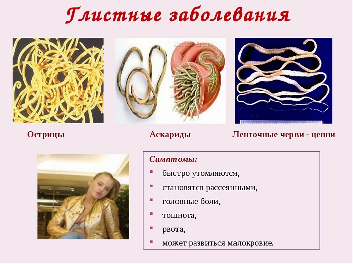 Аскариды – это один из видов глистов, появление которых вызывает у человека сильное головокружение, диарею, боль в области живота, возбужденное нервное состояние, постоянна тревога на душе в ночное время суток. Также данные паразиты можно заметить в каловых массах. Острицы чаще всего вызывают неправильный режим сна, снижение аппетита, зуд в районе ануса, раздражительность. Другой вид паразитов под названием солитер приводят к поносу, дискомфорт в желудке, резкое повышение аппетита, болевые ощущения в районе печени, а также их присутствие в каловых массах.