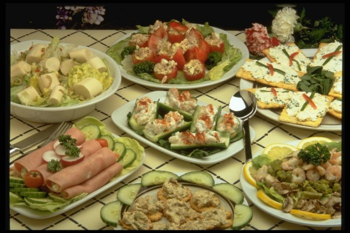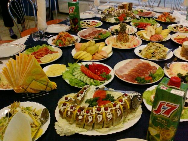 И конечно, бутерброды — без них тоже не обойтись на праздничном столе. Начинка может быть абсолютно разная. Нарезанный батон следует обжарить слегка на подсолнечном масле — получатся прекрасные гренки, которые затем смазываются майонезом. Сверху выкладываем например, шпроты. Рядом — колечко огурчика и помидорчика. Веточку укропа. Очень вкусно, пальчики оближешь. Можно добавить ломтик вареного яичка. Тоже не помешает.