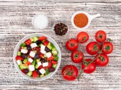 Теперь перейдем к овощам. Огурцы и помидоры нужно нарезать небольшими кубиками. Лук можно мелко нарезать или натереть на терке, чтобы он не был слишком грубым в салате. Зелень мелко нарежьте.