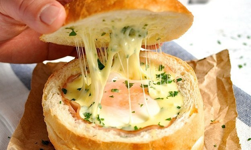 Нарезать и уложить половину хлеба, покрыв дно формы для выпечки. Налейте половину молочной смеси на хлеб посыпаем половину всего натертого сыра Чеддер. Покрываем ветчиной, а затем повторите слой хлеба, молока и Чеддера. Накройте блюдо. Пусть постоит часок.