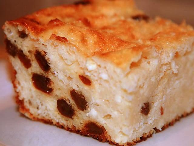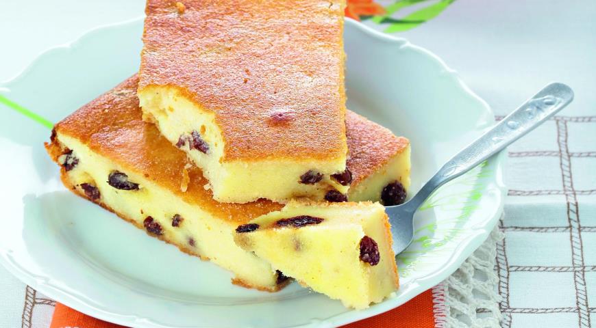 Сначала готовим песочное тесто для творога, его лучше растирать с помощью вилки. Нежным и воздушным получится блюдо, если протереть творог через сито. К этой массе добавляем яйца, сахар и соль. Тщательно перемешиваем до однородности. Изюм заранее нужно замочить и добавить в перемешанную массу, туда же отправляем манку. Снова нужно хорошенько перемешать.