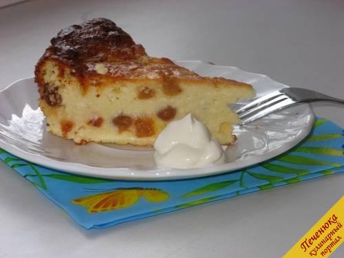 Форму смазать маслом, переместить приготовленную смесь, выдержать 10 минут, после чего отправить в нагретую до 180 градусов духовку. Печь 40 минут до готовности. Когда запеканка подрумянится, смело доставайте десерт. Не забудьте сверху щедро полить сметанкой.
